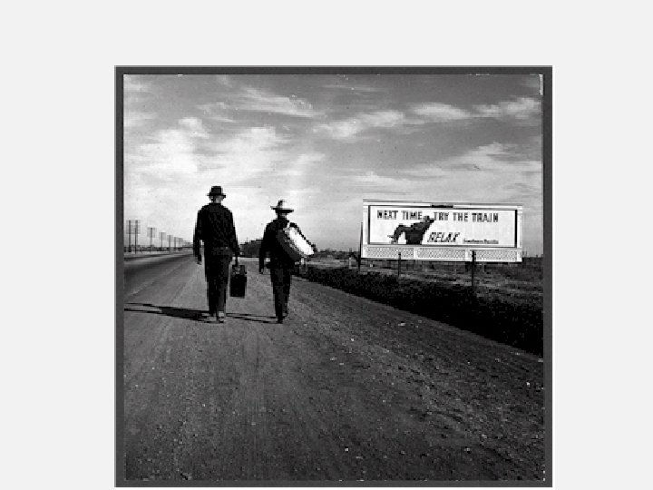 THE DUST BOWL • Environmental catastrophe affecting the Great Plains from Texas to the Dakotas • Natural factors: severe drought, high winds and temperatures • Human factors: overproduction of the land, left nothing holding down the top soil • Led to massive Dust Storms or “black blizzards”, dust was carried as far east as Washington D. C. • Ruined farms and forced many families to move to places like California • The Resettlement Administration was established to focus on land reform and help poor farmers