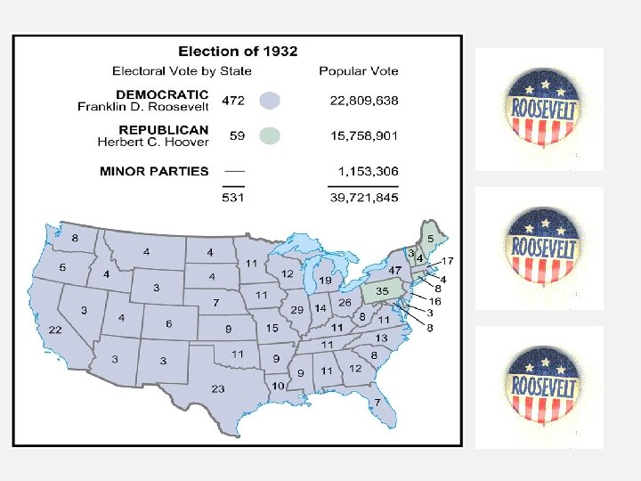 FDR easily won the 1932 election • Democratic, 2 -term governor of New York • FDR was a distant cousin of Teddy Roosevelt • Suffered from polio, which makes him more compassionate and understanding • Married to Eleanor Roosevelt – social reformer and Democratic activist • Wins every state south and west of Pennsylvania • The Democrats also won huge victories in the house and senate • Greatest Democratic victory in 80 years