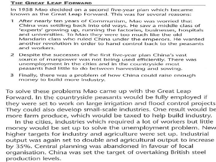 The Great Leap Forward • What is the Great Leap Forward? • A five year plan to develop the agriculture and industry in China • When did the Great Leap Forward take place? • 1958 -1963