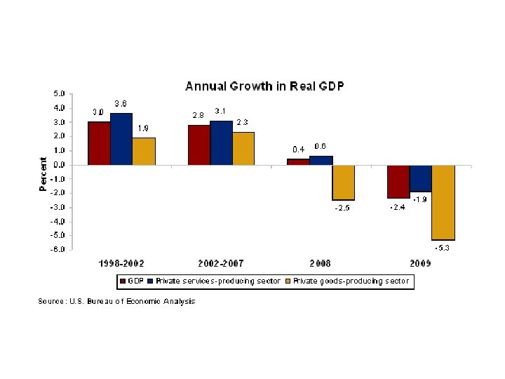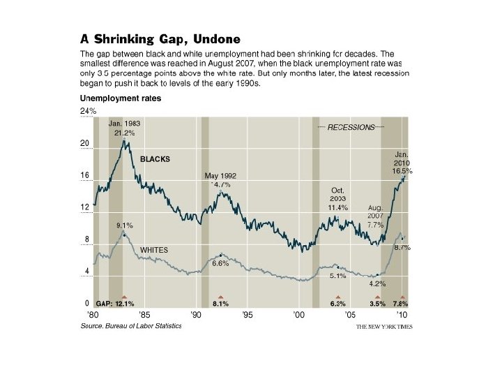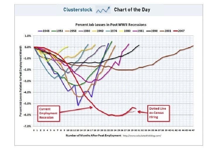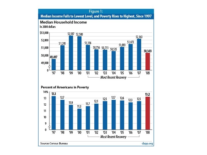 Aughts were a lost decade for U. S. economy, workers By Neil Irwin Washington Post Staff Writer Saturday, January 2, 2010 [The January 8, 2010 US Labor Department] report caps a disastrous year for U. S. workers. Employers cut 4. 2 million jobs in 2009, and the unemployment rate averaged 9. 3 percent. That's compared to an average of 5. 8 percent in 2008 and 4. 6 percent in 2007. The economy has lost more than 8 million jobs since the recession began in December 2007. Median household income, adjusted for inflation, fell 3. 6% last year (2008) to $50, 303, the steepest year-overyear drop in forty years. The largest decline, 5. 6%, was among Hispanics, a reflection of disappearing construction and service jobs. The median income for Asians fell 4. 4%, while black incomes fell 2. 8% and non-Hispanic whites fell 2. 6%. The poverty rate, at 13. 2%, was the highest since 1997. About 700, 000 more people didn't have health insurance in 2008 than the year before. While the number of people with health insurance declined, the number of people covered by government insurance increased by 4. 4 million people, in part because of surging Medicaid rolls. — U. S. consumers and businesses are filing for bankruptcy at a pace that made 2009 the seventh-worst year on record, with more than 1. 4 million petitions submitted, an Associated Press tally showed Monday. The AP gathered data from the nation's 90 bankruptcy districts and found 1. 43 million filings, an increase of 32 percent from 2008. There were 116, 000 recorded bankruptcies in December, up 22 percent from the same month a year before.