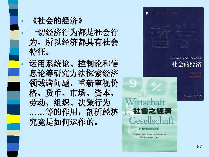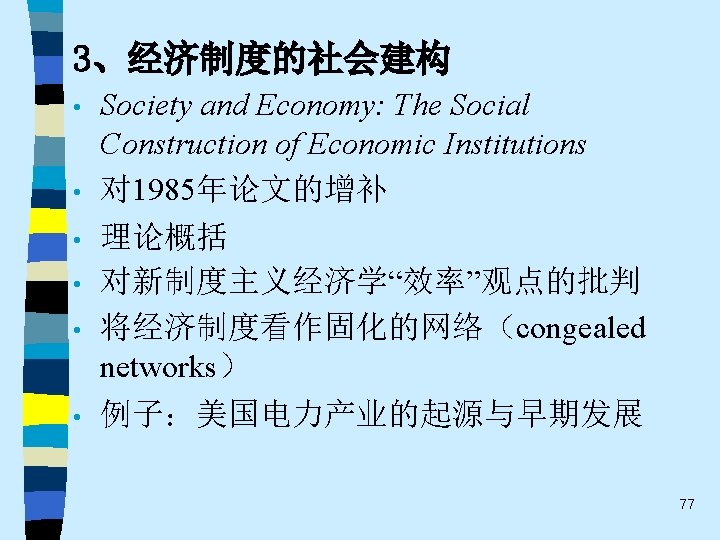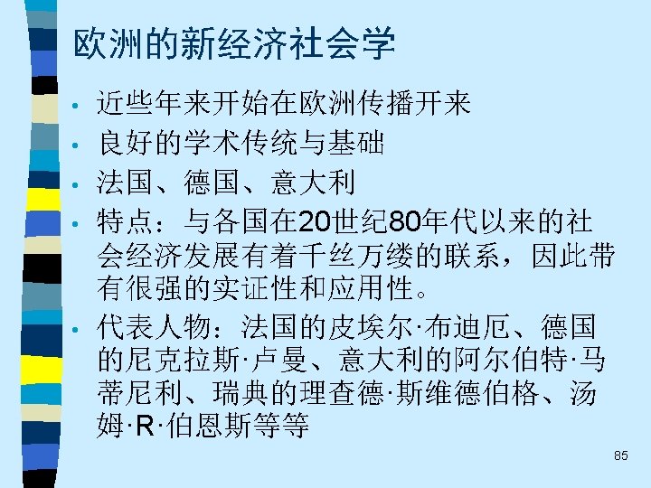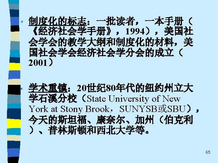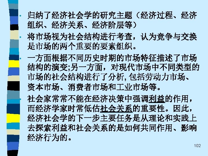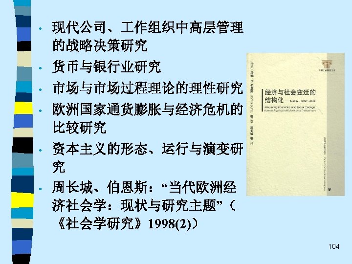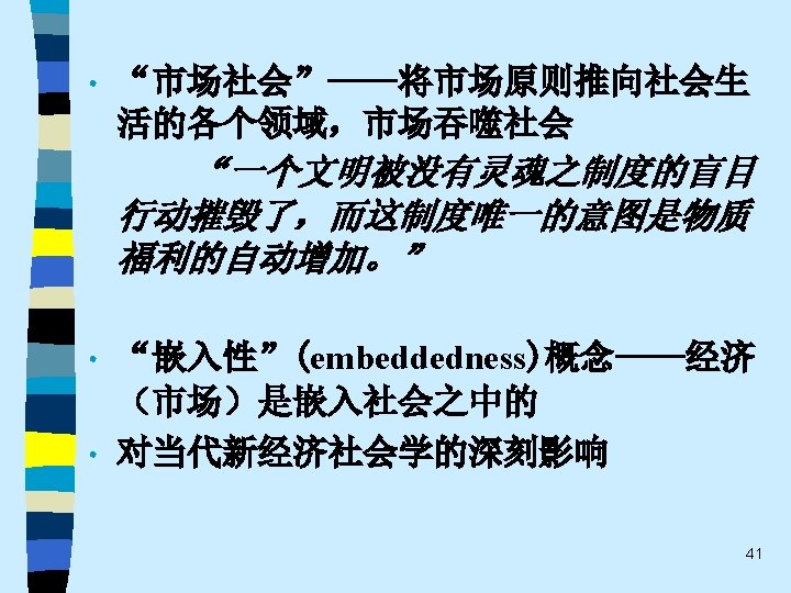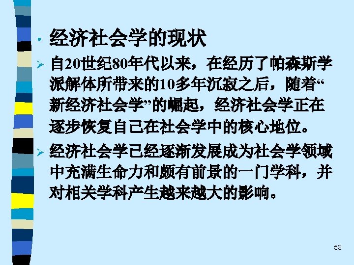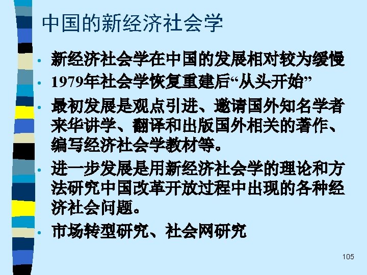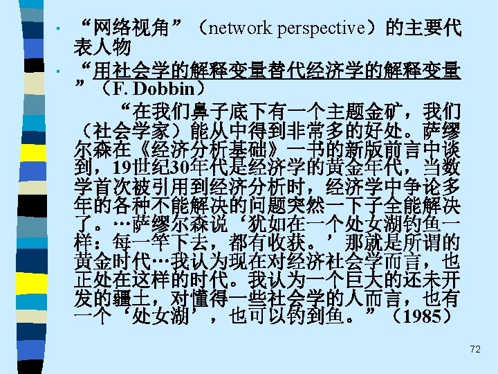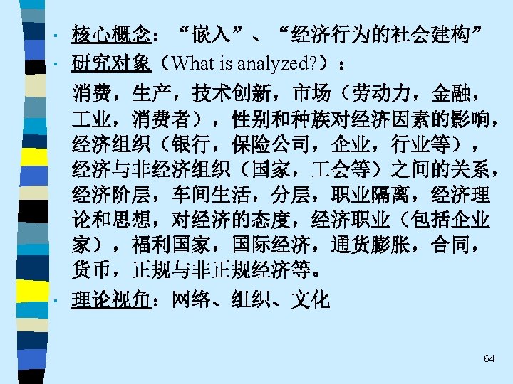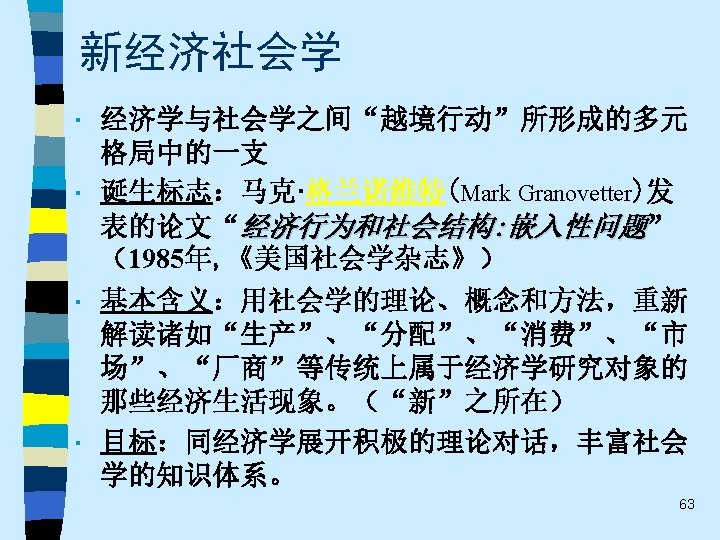 • 趋势之四 While the current pluralistic approach moves along the right lines, the bolder efforts of the classics at theoretical synthesis are notably missing. Without that complementary line of theorizing, the field of economic sociology – like any area of inquiry that tends to specialize and sub-specialize – tends to sprawl. Continuing effort to sharpen theoretical focus of economic sociology and to work toward synthetic interpretations of its findings are essential. 60