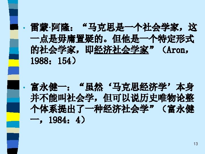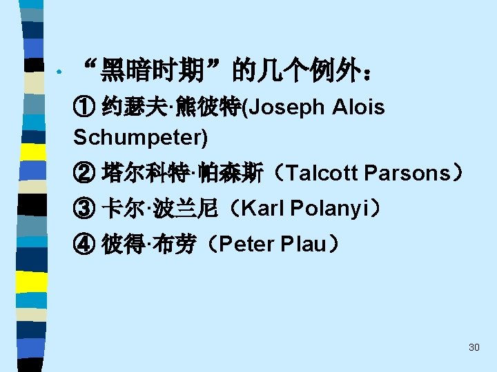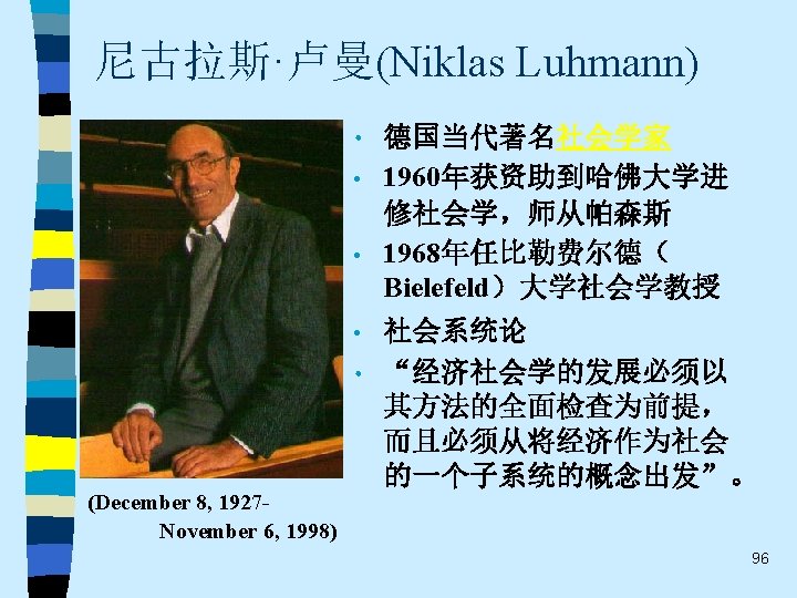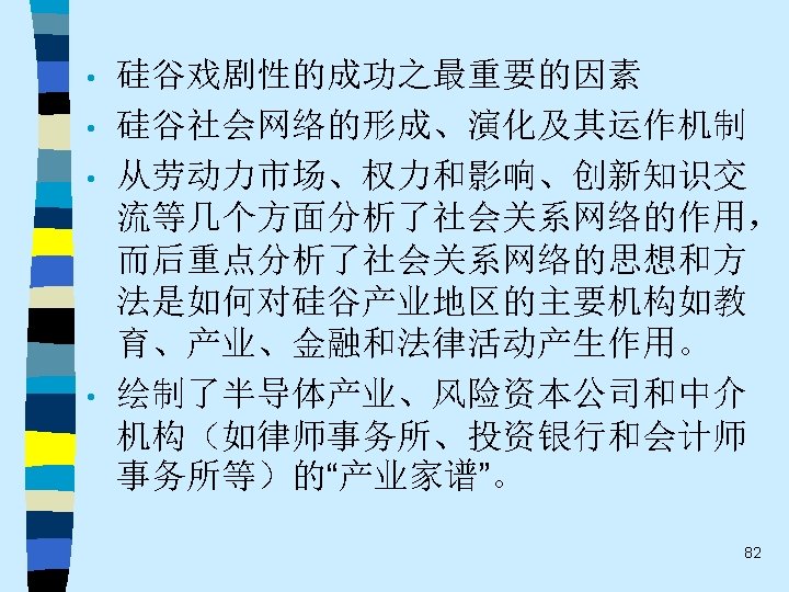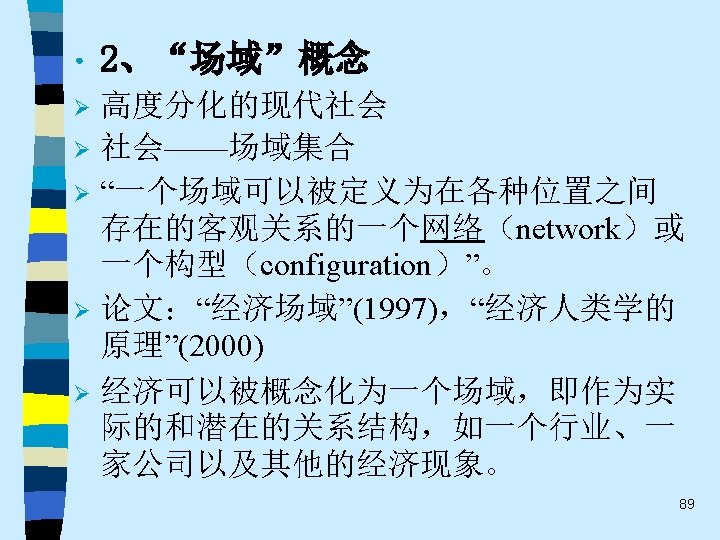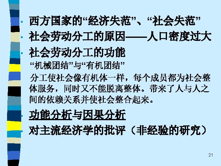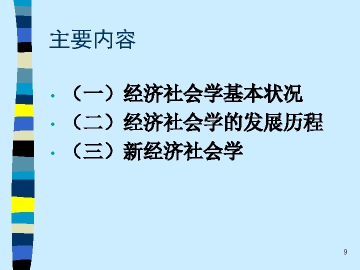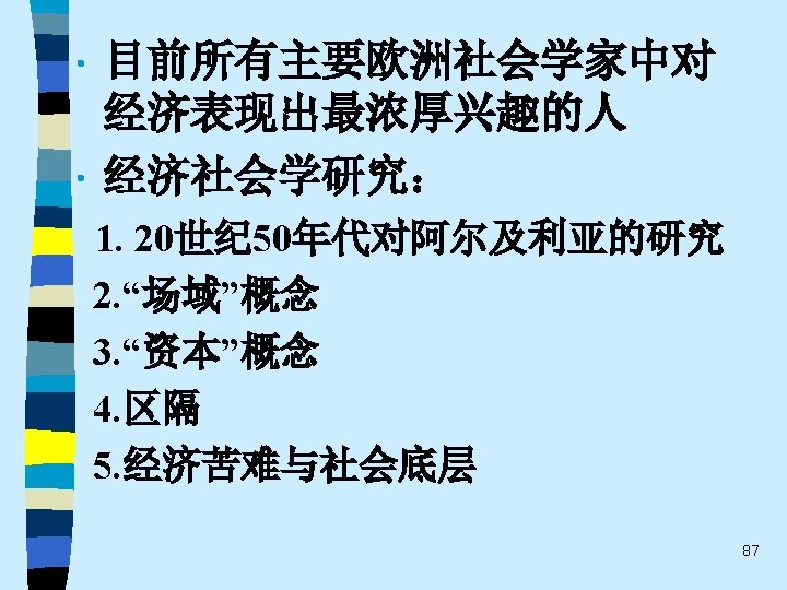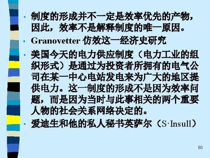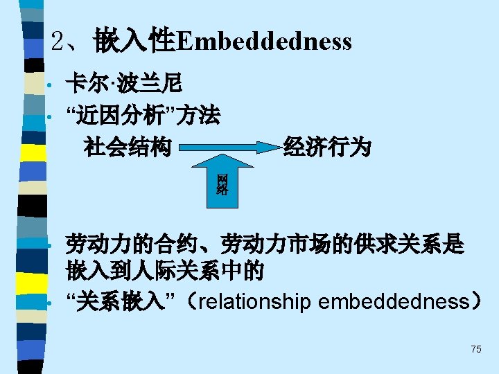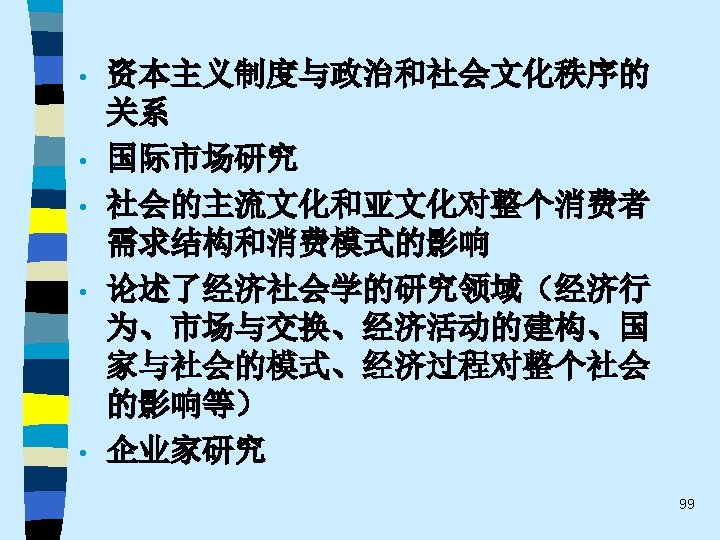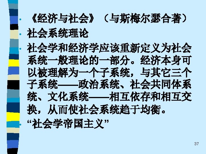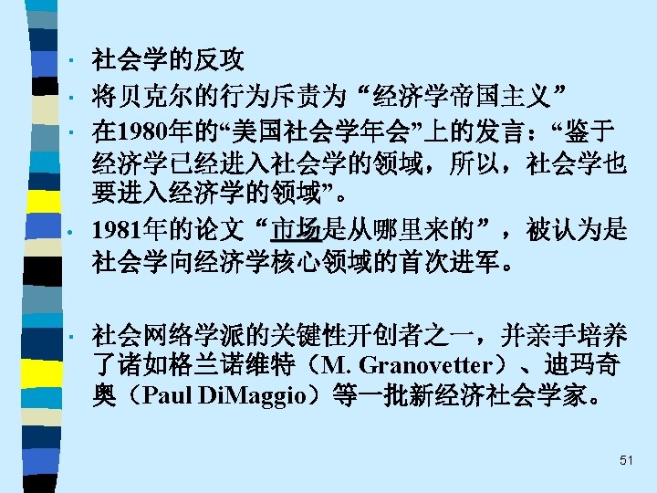 • 趋势之四 While the current pluralistic approach moves along the right lines, the bolder efforts of the classics at theoretical synthesis are notably missing. Without that complementary line of theorizing, the field of economic sociology – like any area of inquiry that tends to specialize and sub-specialize – tends to sprawl. Continuing effort to sharpen theoretical focus of economic sociology and to work toward synthetic interpretations of its findings are essential. 60