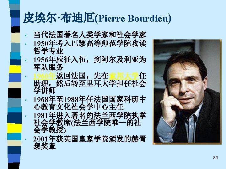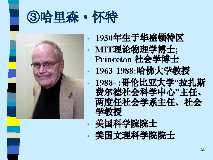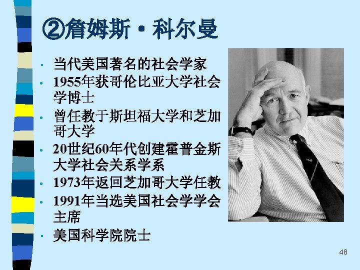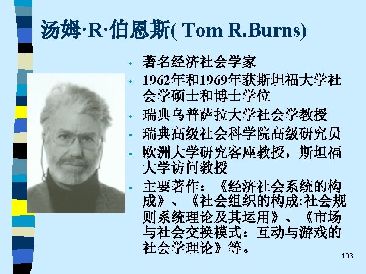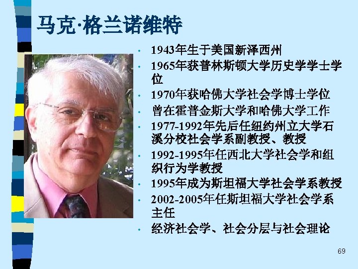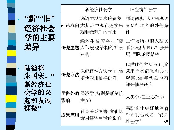 • • Ø Ø Ø 代表人物: Harrison White, Mark Granovetter, Ronald Burt, Neil Fligstein, Alejandro Portes, Paul Dimaggio, Frank Dobbin, Walter Powell, Wayne Baker, Viviana Zelizer…… 重要著作: Mark Granovetter 《找 作》(Getting a Job, 1974) Ronald Burt《结构洞》(Structural Holes, 1992) Neil Fligstein《公司控制的转型》(The Transformation of Corporate Control, 1990) Viviana Zelizer 《市场与道德》(Markets and Morals, 1979 ) 、《为无价的儿童定价》(Pricing the Priceless Child, 1985) Alejandro Portes《移民的经济社会学》(The Economic Sociology of Immigration, 1993) …… 67