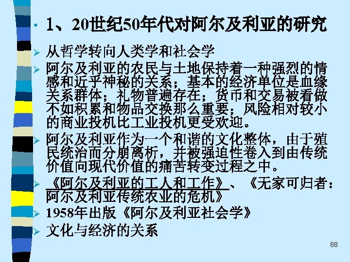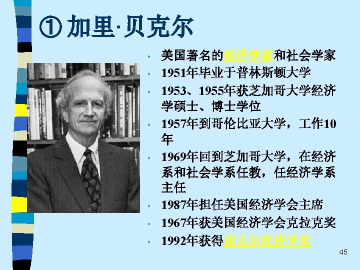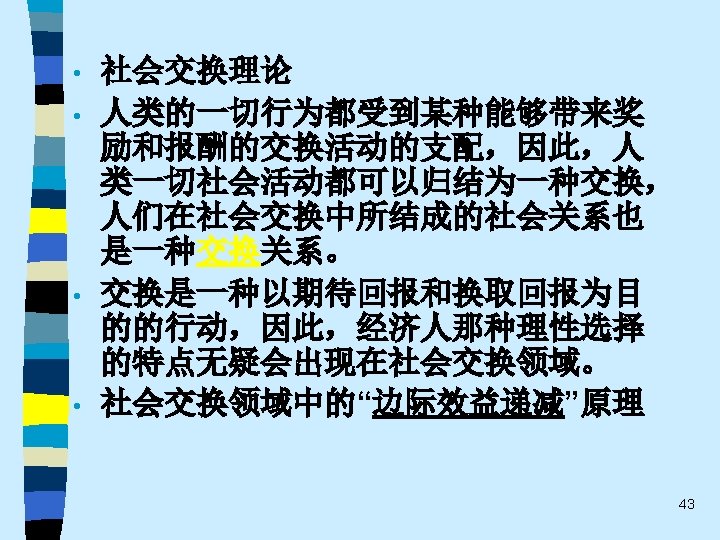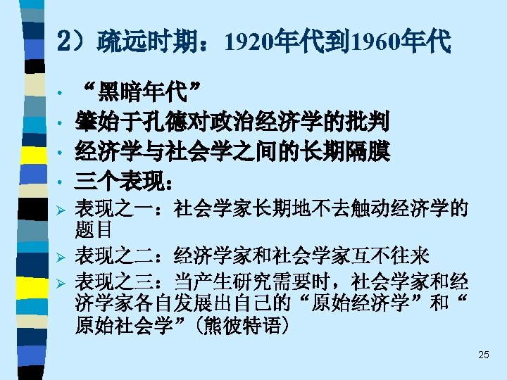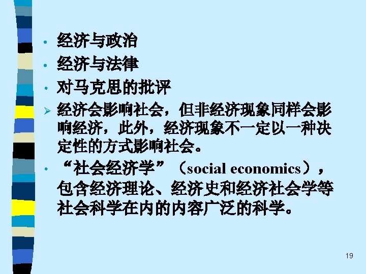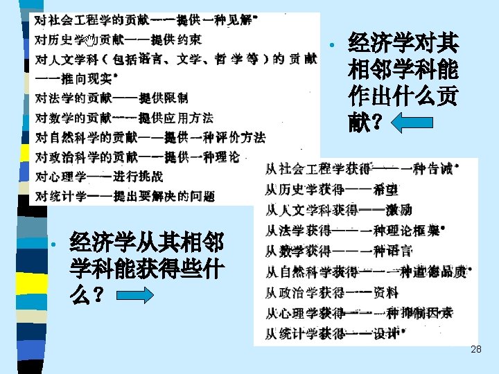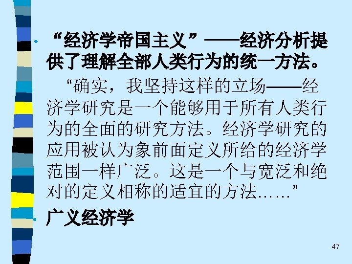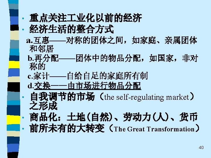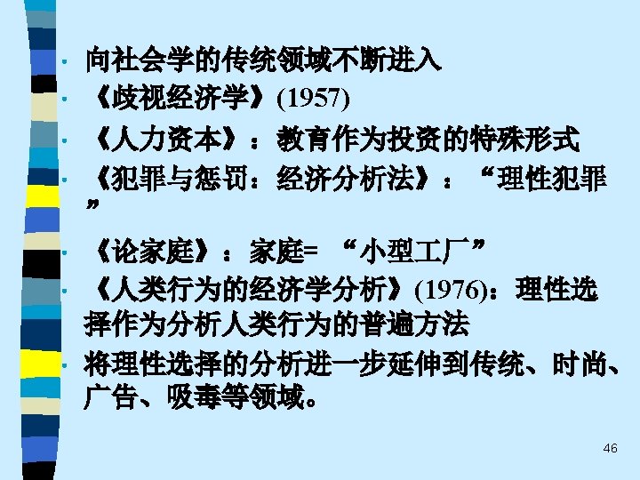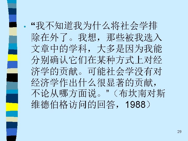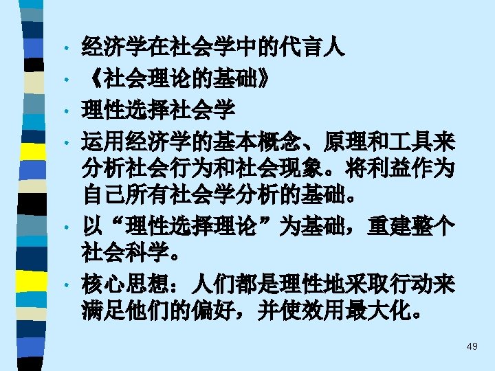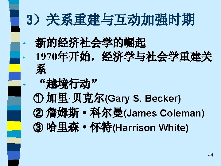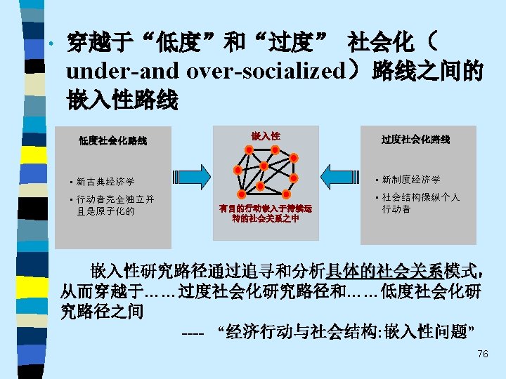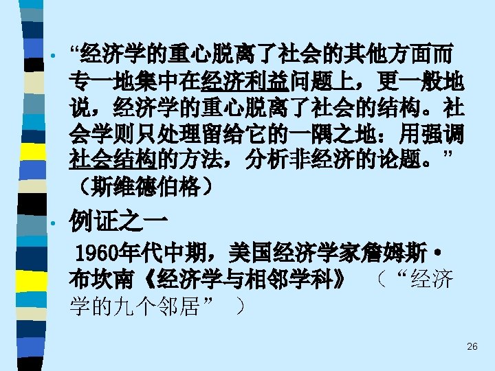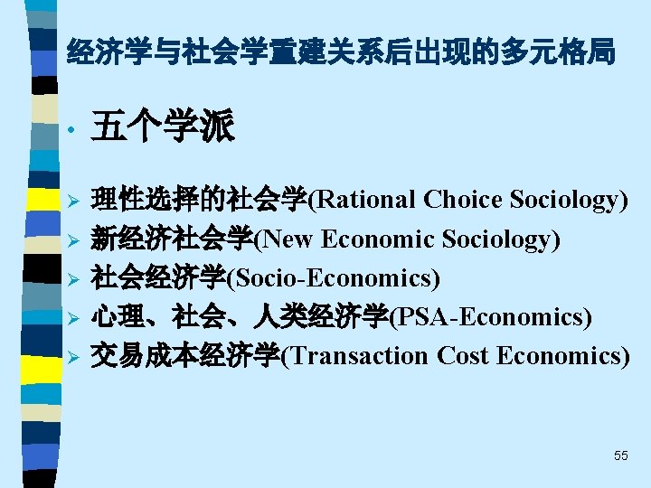 • 趋势之五 One of the most promising modes of relating the fields of economics and sociology remains that which might be termed “ complementary articulation”. Of necessity, any line of disciplined inquiry focuses on certain operative variables and determinants, and “freezes” others into parametric assumptions. Often the territory thus frozen is that very territory that is problematical from the standpoint of another line of social science inquiry. It is this dialogue about the precise role of operative variables and the conceptual status of parameters that holds out the best promise for communication and theoretical development in both economics and sociology. This strategy appears much more engaging that the several polemic hostility, mutual separation and toleration, or shapeless eclecticism(折中主义). 61