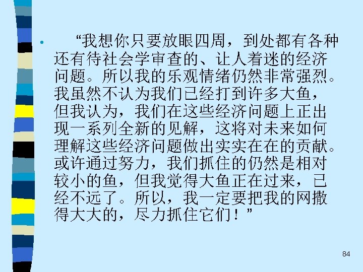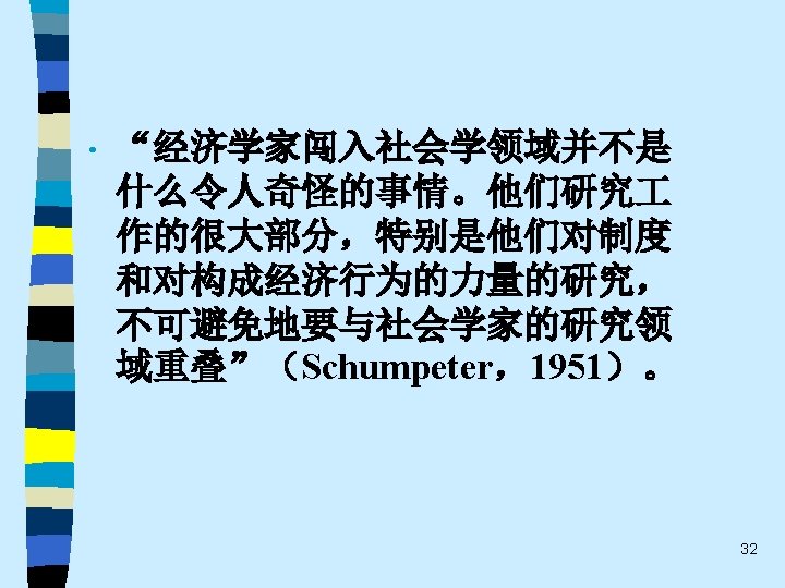 • 趋势之六 Given the void after a century’s neglect of economic institutions, we also expect that new questions will be raised that cut across the conventional boundaries between economics and sociology. For this reason it is essential that there exists a willingness, among economists as well as sociologists, to entertain new and unfamiliar ideas. An opportunity such as the current one is rare and should not be neglected. 62