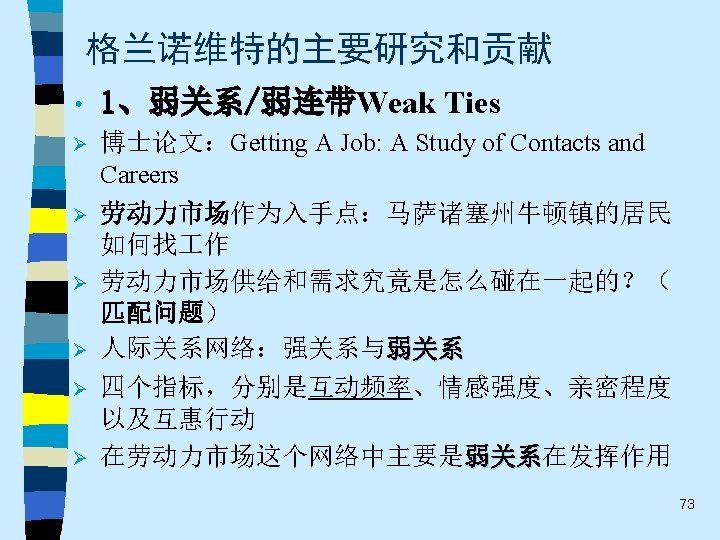 • • • 1973. "The Strength of Weak Ties. " American Journal of Sociology, 78 (May): 1360 -1380. 1978. "Threshold Models of Collective Behavior. " American Journal of Sociology, 83 (May): 14201443. 1985. "Economic Action and Social Structure: The Problem of Embeddedness. " American Journal of Sociology, 91(November): 481 -510. 1988. "Inequality and Labor Processes" (With Charles Tilly). In Neil Smelser, ed. , Handbook of Sociology, pp. 175 -221. Newbury Park, CA: Sage Publications. 1995. "Coase Revisited: Business Groups in the Modern Economy". Industrial and Corporate Change 4(1): 93 -130. 70