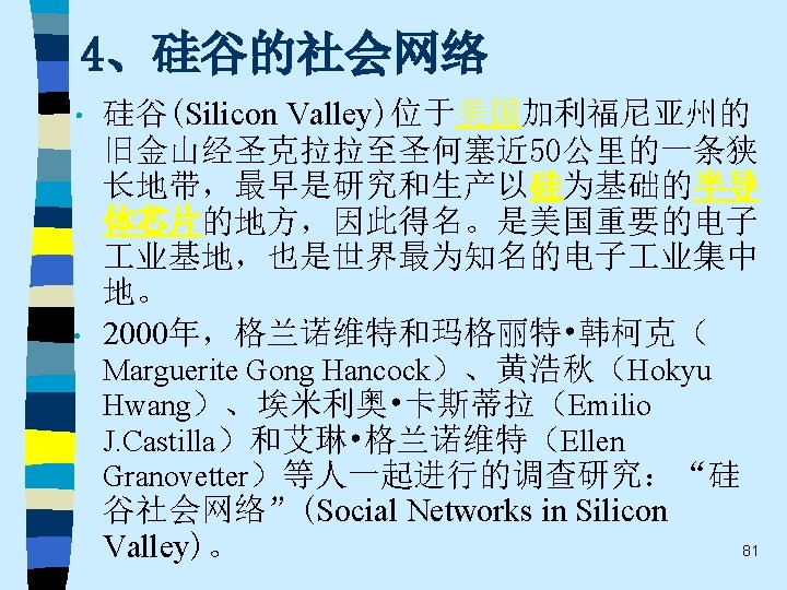 • • • 1995. Getting a Job: A Study of Contacts and Careers, Careers 2 nd Edition (with a new Preface and a new chapter updating research and theory since the 1974 edition). University of Chicago Press (paperback). 1998. "The Making of an Industry: Electricity in the United States". With Patrick Mc. Guire. Pp. 147 -173, in Michel Callon, editor, The Laws of The Markets, Oxford: Blackwell. 2000. "Social Networks in Silicon Valley". With Emilio Castilla, Hokyu Hwang and Ellen Granovetter. Pp. 218 -247 in Chong-Moon Lee, William F. Miller, Marguerite Gong Hancock, and Henry S. Rowen, editors, The Silicon Valley Edge. Stanford: Stanford University Press. 2001. The Sociology of Economic Life, 2 nd edition, edited with Richard Swedberg. Boulder, CO: Westview Press. 2002. "A Theoretical Agenda for Economic Sociology". Forthcoming in Mauro Guillen, Randall Collins, Paula England Marshall Meyer, editors. The New Economic Sociology: Developments in an Emerging Field. New York: Russell Sage Foundation. 71