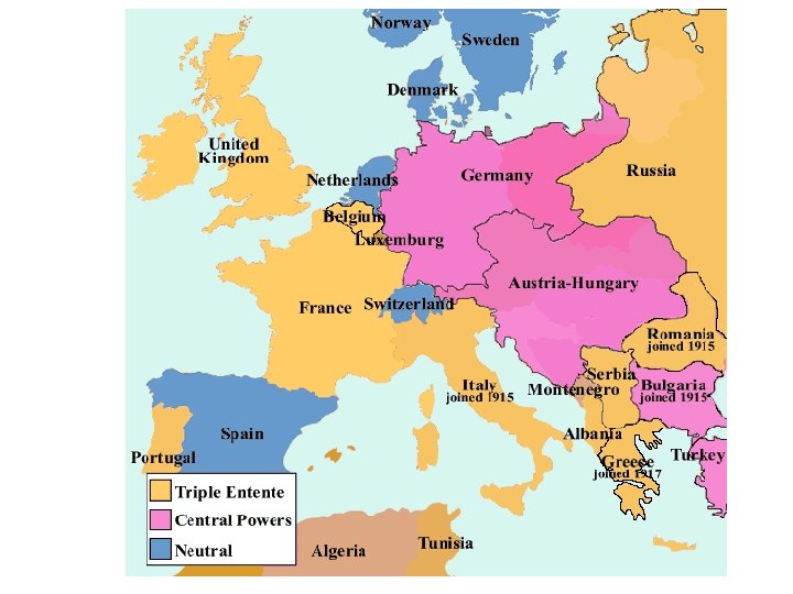 Alliances “I’ve Got Your Back. ” • Militarism caused distrust among European nations. • Alliances were formed between nations vowing to protect one another in case of attack. • The Central Powers- Germany and Austria-Hungary formed an alliance against France. • The Allies- France and Russia formed an alliance and later Great Britain formed an entente, a binding agreement to follow the same policies.