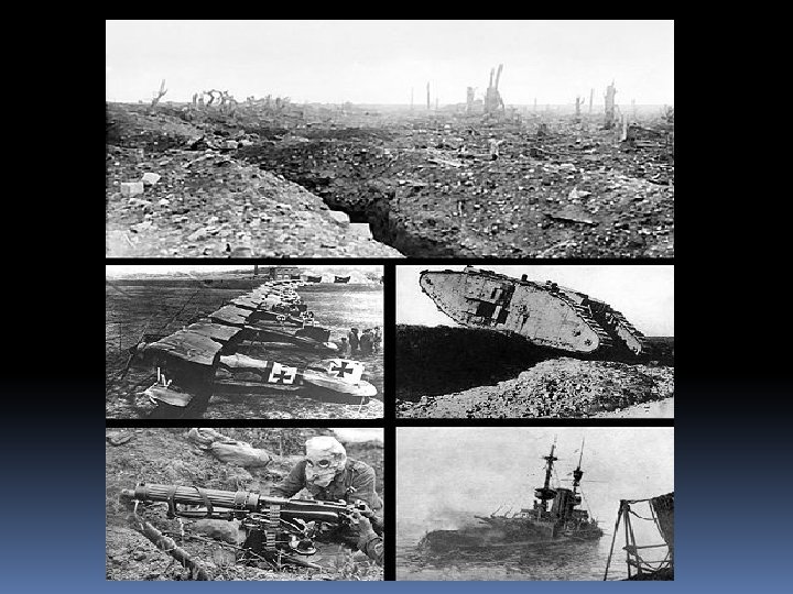 Weapons of war Poison gas – introduced by Germans, used by both sides. Invention of gas mask Machine gun – causes a stalemate Tank – introduced by British Airplane – first used for photographs then bombs then air combat (Red Baron)