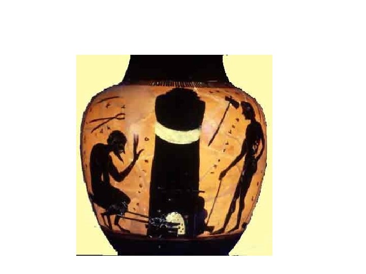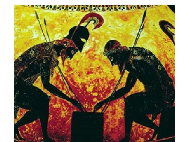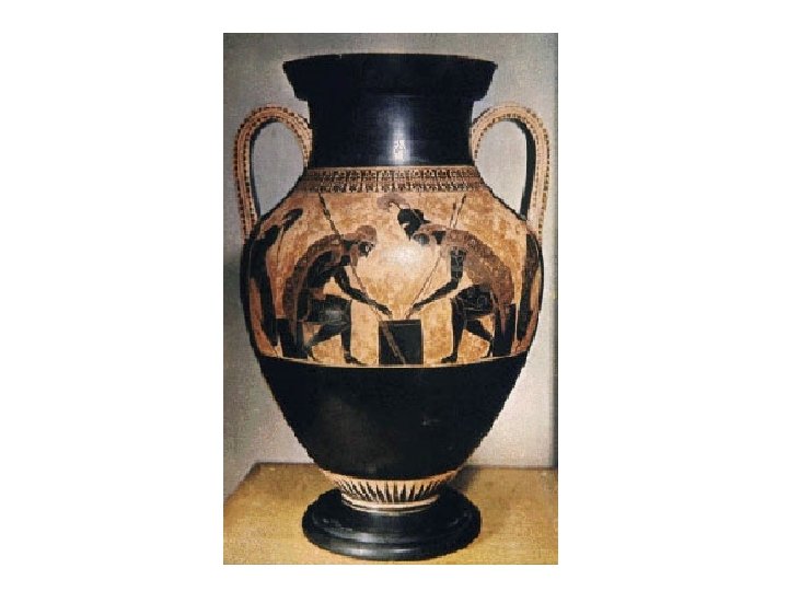Greek Vases: Archaic Period • c. 700 -480 BCE • Black or brown figures painted in the central area of the vase—background is red color of clay • Scenes from everyday life, literature, mythology • Example: Achilles and Ajax Playing Dice, c. 530 BCE