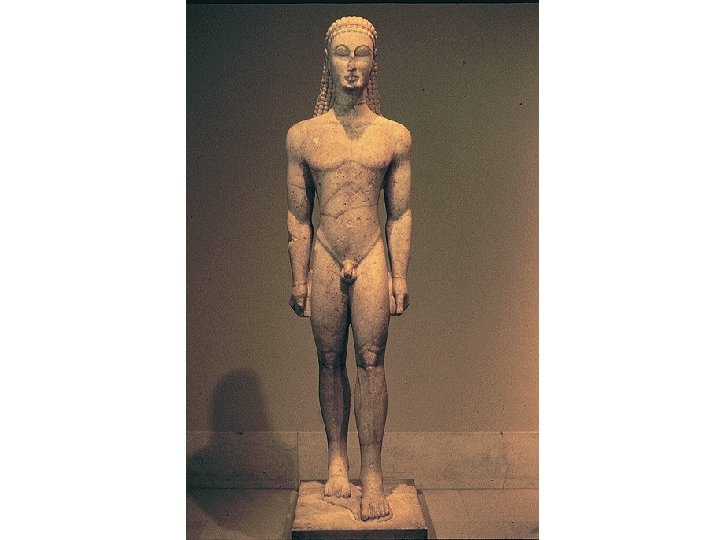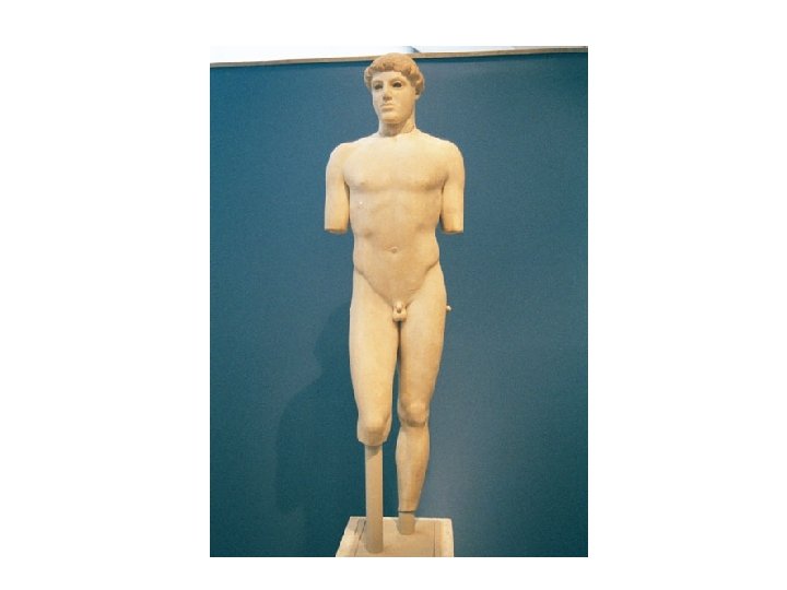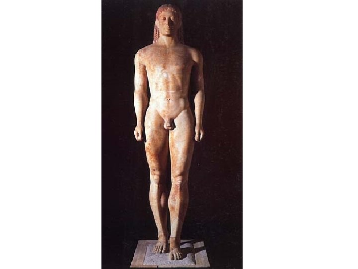 Greek Sculpture: Archaic Period • c. 700 -480 BCE • Freestanding male nude, for “cult statues, funerary monuments, memorials” (111) • Kouros (male youth) from 600 BCE • Rigid, block-like • Body weight distributed equally on both feet