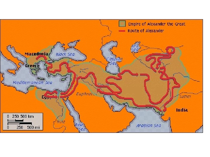Alexander the Great (356 -323 BCE) • Son of Philip of Mecedonia, who defeated the Greeks in 338 BCE and was assassinated two years later • His conquests created an empire stretching from Greece and Egypt to India • He spread Greek language and culture into Asia