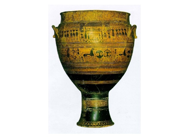 Greek Vases: Geometric Period • c. 1200 -700 BCE • “complex geometric patterns organized according to the shape of the vessel” (109) • Example: Krater, c. 750 BCE