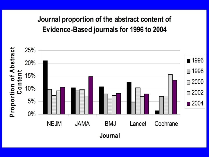 1996 – Journal proportion of A-list JClub & EBM Proportion of abs that are systematic reviews: 26% Of these, Cochranes are 5%