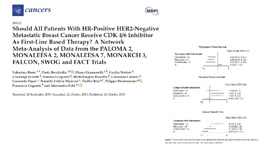 Conclusions: CDK 4/6 produced significant improvement in PFS, CB, ORR in all pts The results are indipendent of age, race, PS, Disease site, prior Ct or ET Indipendent of menopausal status, DFI, CDK 4/6 Inhibitor, and Pg. R expression Improvement of PFS in favor of CDK 4/6 inh even in pts with bone only disease or in non visceral disease
