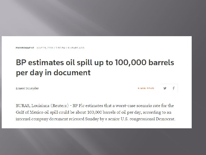 Velocity based flow estimate � � � Diameter of pipe is 21 inches cross section is. 2 square meters Volume flow rate is then 1 m/sec *. 2 =. 2 cubic meters per second. 2 * 3600 seconds per hour = 720 cubic meters per hour = 720, 000 liters/hour One bbl = 159 liters. Thus 720, 000/159 = 4500 barrels/hour (in round numbers) 4500 x 24 = 108, 000 barrels per day 100 times worse than the initial estimate