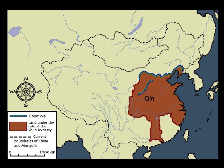 Qin Shi Huangdi 1 st Emperor Ruthless—Totalitarian Legalism adopted Qin Dynasty Territorial Expansion begins 214 221 -206 BCE Book burning-213 BCE Standardized weights and measures Single money system Uniform writing system Postal system Great Wall Bankrupted China Pottery Army-210 BCE Forced labor § First time China united as one empire