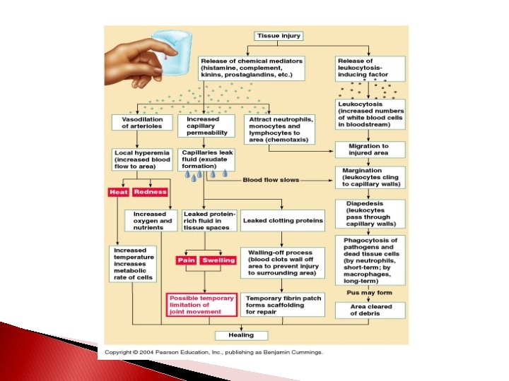 Check In � Question – Destruction of tissue = injury to ? , which in turn leads to the release of what? � Answer – Cells; fluids, other cells, wastes � Question - What does the release of these materials initiate? � Answer – Inflammatory response � Question – Why are leukocytes, phagocytes, and exudate delivered to the area? � Answer – Localize response to begin phagocytosis; protective reaction