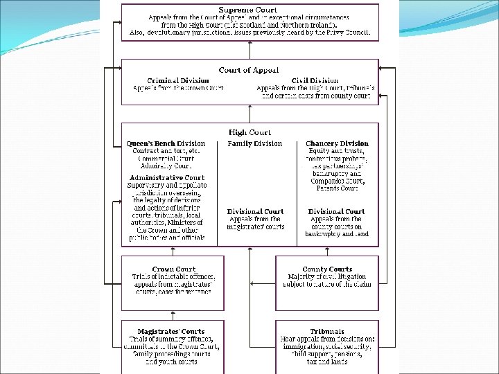 The hierarchy of courts When a point of European Law is involved, the decisions of the European Court of Justice are binding on all courts in England Wales The House of Lords used to be the highest court in England Wales; Hierarchy: The Supreme Court of Appeal Divisional Courts High Court Crown Court Inferior courts: Magistrates’ Court, County Court, Tribunals