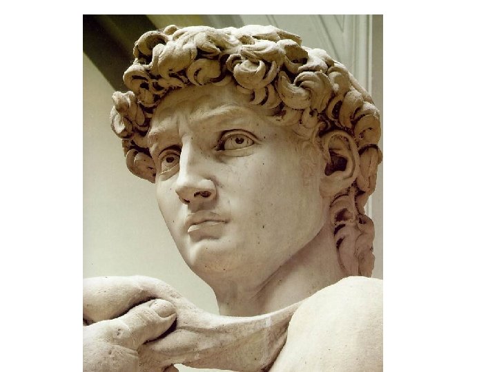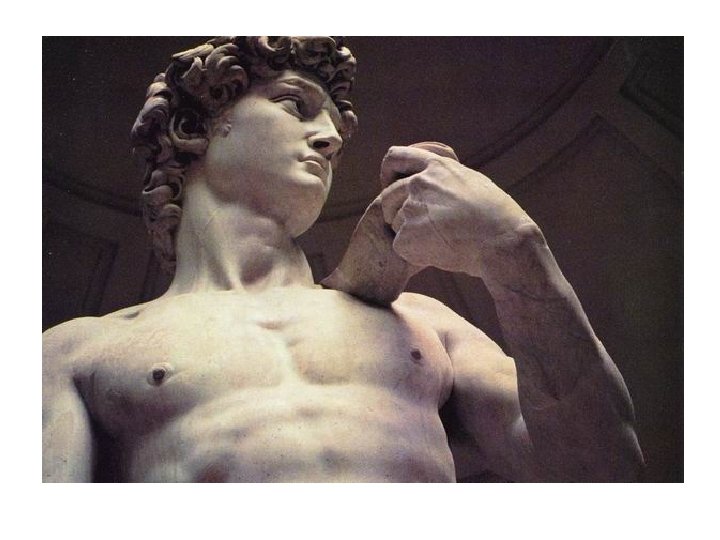 • Traditionally, David was portrayed after his victory, triumphant over the giant Goliath. Both Verrochio’s and Donatello’s Davids are depicted standing over Goliath's severed head. • Michelangelo has depicted David before the battle. Davis is tense, but not so much in a physical as in a mental sense. The slingshot he carries over his shoulder is almost invisible, emphasizing that David's victory was one of cleverness, not sheer force.