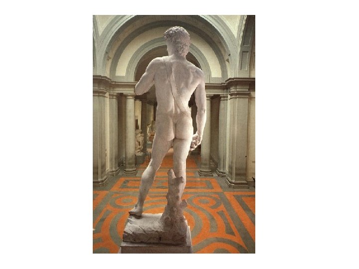 Facing down the enemy • Michelangelo was a citizen of the city state of Firenze (Florence), and Florence was surrounded by much more powerful enemy city states. • When the statue of David was placed on the square in front of the city hall, the people of Florence immediately identified with him as the cunning underdog triumphing over the big bad guy. David was positioned so that his glare was directed south, toward the rival city of Rome.