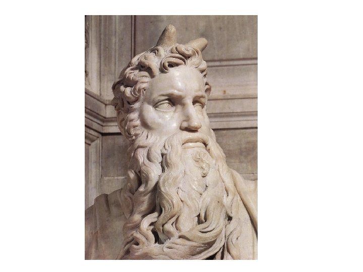 Moses • Moses, sculpted in marble, has horns on his head, in the manner that was traditional in medieval depictions of Moses (tongs of fire according to the bible). • Horns were symbolic of authority in ancient Near Eastern culture, and the medieval depiction had the advantage of giving Moses a convenient attribute by which he could easily be recognized in crowded pictures.