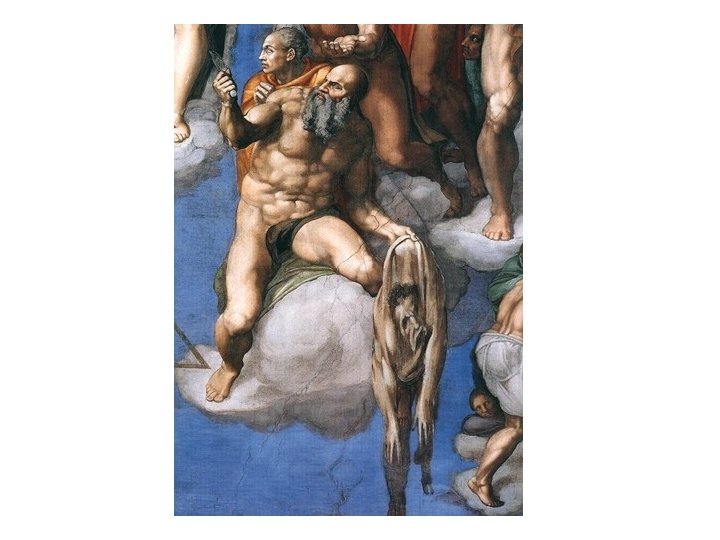 • The Last Judgment was a source of conflict between Cardinal Carafa and Michelangelo: the artist was accused of obscenity, having depicted naked figures, inside the most important church of Christianity, ) • When the Pope's own Master of Ceremonies, Biagio da Cesena, said that it was no work for a papal chapel but rather "for the public baths and taverns, " Michelangelo worked Cesena's face into the scene as Minos, judge of the underworld (far bottom-right corner of the painting) with Donkey ears {i. e. foolishness} while his nudity is covered by a coiled snake. • It is said that when Cesena complained to the Pope, the pontiff joked that his jurisdiction did not extend to hell, so the portrait would have to remain