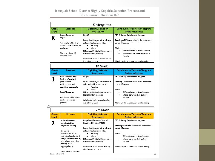 How Do We Determine our Most Highly Capable Students? • Each school district determines who their “most highly capable students” are: • Top 3‐ 7% of ISD students • Multiple measures must be used • District determines score “cut off” (based on ISD peers and “local norms”) • Each school district determines appropriate services to offer identified students • Services should be based on student need (identified area of strength) AND • Available resources of the district