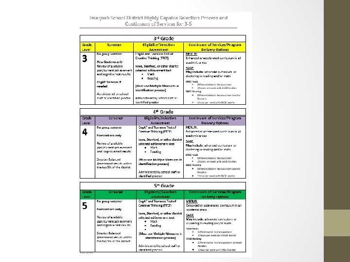 HCP Continuum Detail: 4 th Grade Level 4 Screener No group screener Eligibility/Selection Assessment Cog. AT and Torrance Test of Creative Thinking (TTCT) Nominations only Review of available past/current achievement and cognitive test results Smarter Balanced Assessment results within the top 5% of the district Iowa, Stanford, or other district selected achievement test Math Reading (Must use Multiple Measures in identification process) Administered by school staff or identified proctor Continuum of Services/Program Delivery Options MERLIN: Enhanced or accelerated curriculum in all academic areas SAGE: May include: advanced curriculum or clustering in reading and/or math SAGE Math Differentiation in the classroom 2 hours per week with SAGE teacher SAGE Reading Differentiation in the classroom‐Leveled Readers 1 hour per week with SAGE teacher