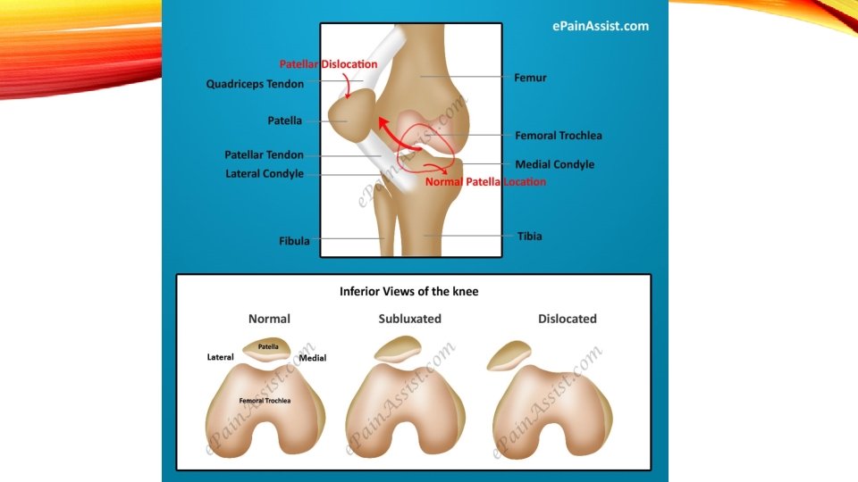 DISLOCATIONS: TIBIAL FEMORAL AND PATELLAR • Tibial Femoral: Multiple Ligaments are torn! Could be combined with a fracture; massive pain, swelling, deformity call 911! • Rare in sports • Follow-up with orthopedic specialist