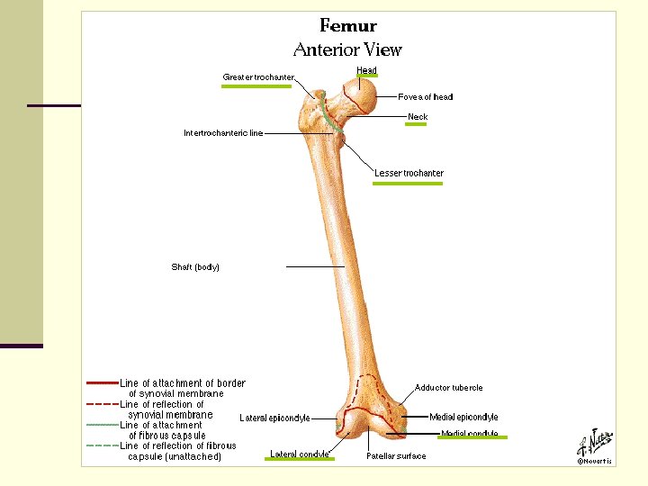 II. The Femur n A. Head n B. Neck n C. Greater Trochanter n D. Lesser Trochanter n E. Linea Aspera - vertical ridge on the posterior surface n F. Lateral Condyle n G. Medial Condyle