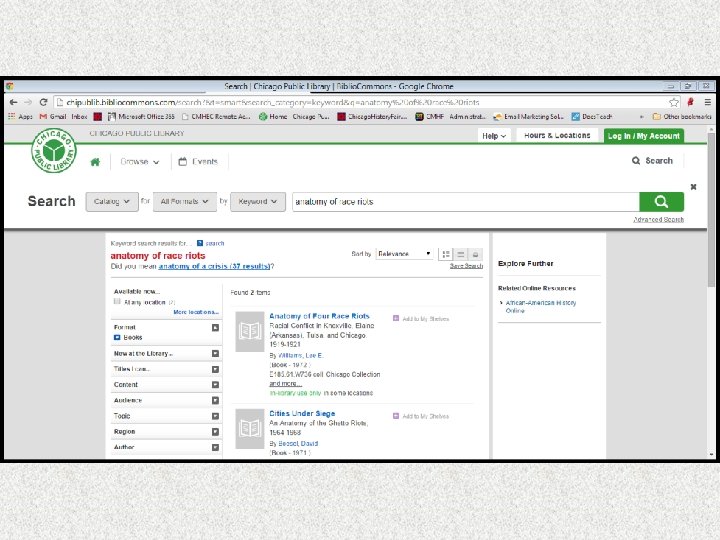 Chicago Public Library Harold Washington Library, Local & Regional Branches, & Online • Books, magazines, journals, newspapers • Online databases with secondary & some primary sources • Online primary sources • Special collections with one-of-a-kind or rare materials for primary sources—Harsh Collection at Woodson & Sulzer regionals & downtown at the HWLC.