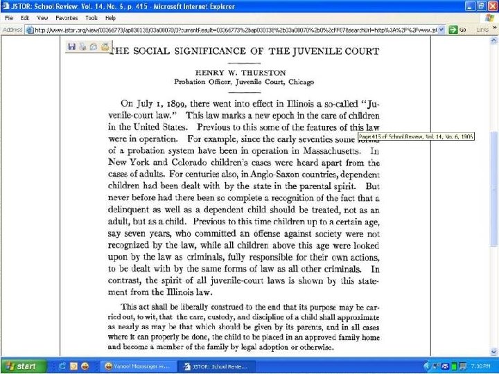 When you use Google: Command Google…. • Group words together: “Juvenile Court History” • Use 2 commands together: “Juvenile Court History” + Chicago • Specify type of website: “juvenile court history”: gov or “juvenile court history”: edu ALSO: Use the “Advanced Search” options. • Use metacrawlers and directories…. • Googlebooks and Google Scholar…. .