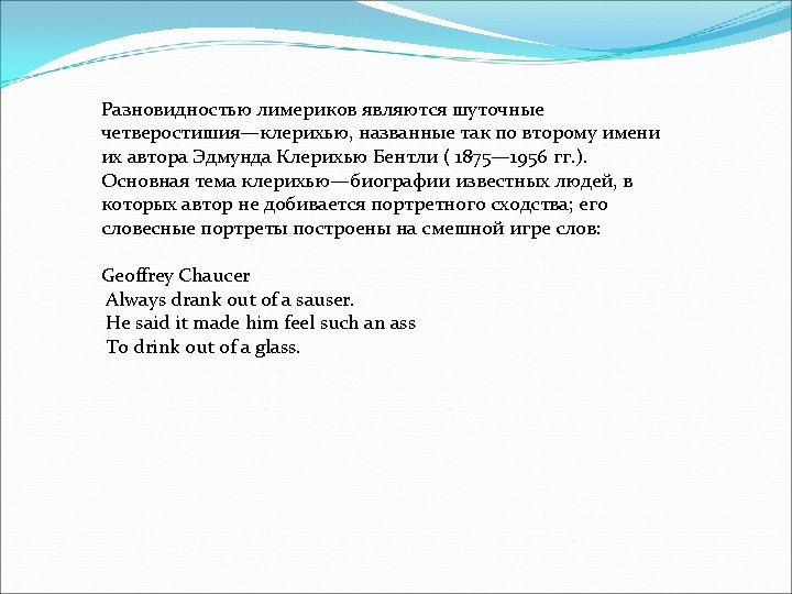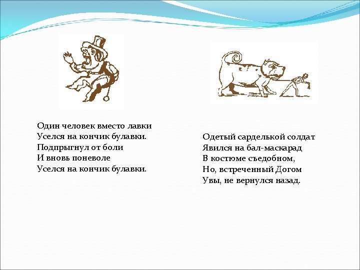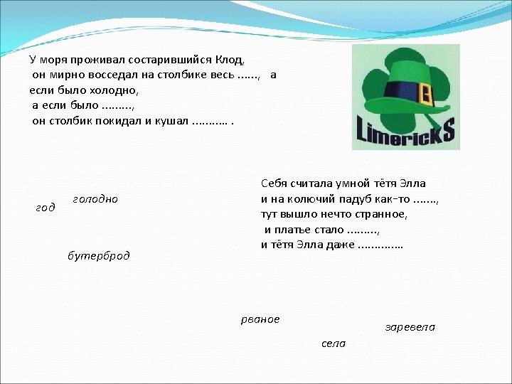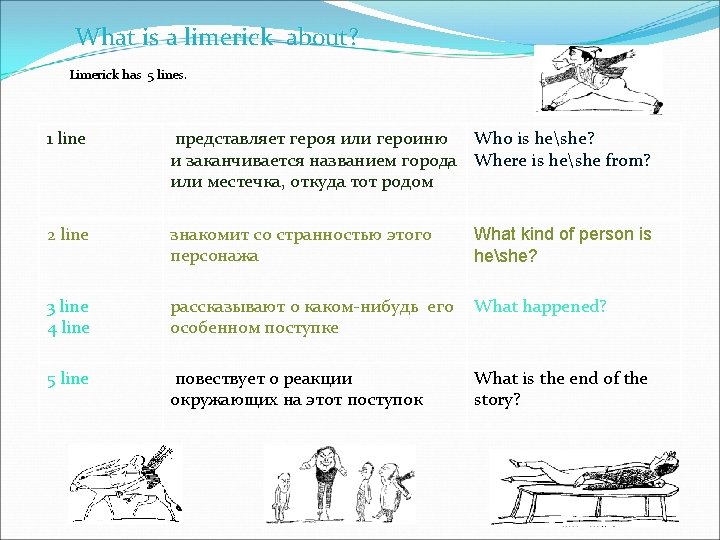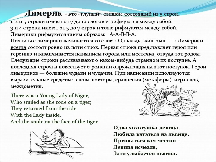 A limerick is a silly poem with five lines. Lines 1, 2, and 5 of Limericks have seven to ten syllables and rhyme with one another. Lines 3 and 4 of Limericks have five to seven syllables and also rhyme with each other. It rhymes - a-a-b-b-a. Limericks often start with the line "There once was a. . . " or "There was a. . . " There was a Young Lady of Niger, Who smiled as she rode on a tiger; They returned from the ride With the Lady inside, And the smile on the face of the tiger. Одна хохотушка-девица Любила кататься на львице. Признаться вам честно – Девица исчезла, Зато улыбается львица.