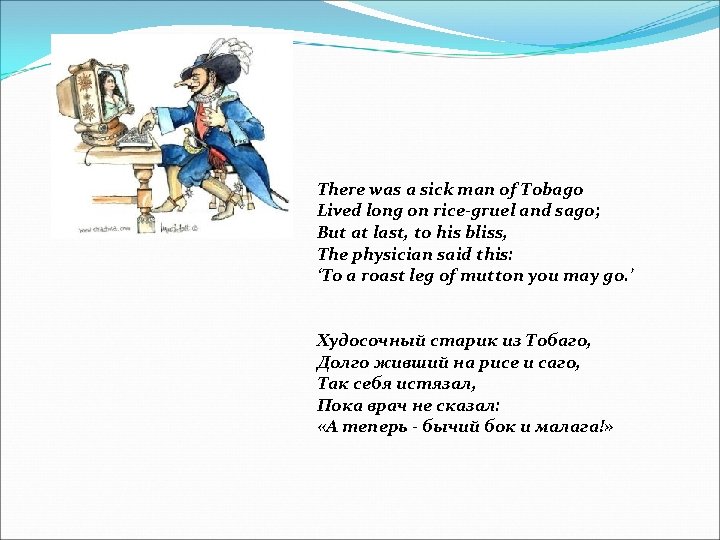 There was a Young Lady of Russia, Who screamed so that no one could hush her; Her screams were extreme, No one heard such a scream, As was screamed by that lady of Russia. There was an Old Person of Gretna, Who rushed down the crater of Etna; When they said, «Is it hot? » He replied, «No, it's not!» That mendacious Old Person of Gretna. There was an old person of Fife, Who was greatly disgusted with life, They sang him a ballad, And fed him a salad Which cured that old person of Fife. There was an Old Man, who when little, Fell casually into a cettle; But growing too stout, He could never get out, So he passed all his life in the kettle. Жил мальчик из города Майена, Свалившийся в чайник нечаянно. Он сидел там, сидел И совсем поседел, Этот бывший мальчишка из Майена. Жил-был старичок у причала, Которого жизнь удручала. Ему дали салату И сыграли сонату, И немного ему полегчало. Некий старец из города Гретны Обнаружился в кратере Этны. «Там не жарко, скажи? » Старец, живший по лжи, «Да ничуть!» - отвечает из Этны. Вот вам некая Мисс из России. Визг ее был ужасен по силе И разил, как кинжал. Так никто не визжал, Как визжала та Мисс из России.