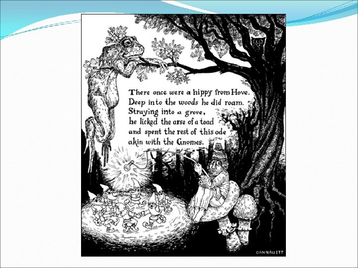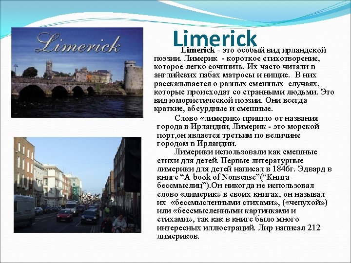 The History Limerick is a form of Irish poetry. Limericks Limerick College of Business Studies were short and easy to compose. They were often read in English pubs by sailors and beggars. They tell about different funny things that happened with strange people. It is a type of humorous poems. It is always short, often nonsensical and funny. The word comes from the Irish town of Limerick, a sea port. Limerick is the third largest city in Ireland. Limericks were used as poems for children. The first limericks for children were written by Edward Lear in 1846 in “A book of Nonsense”. He never used the word "limerick"; in the 1872 in his book, he called his poems "nonsense rhymes", or "nonsense pictures and rhymes" as the illustrations were very nice and very important. Lear wrote 212 limericks. Nonsense - ерунда, чепуха