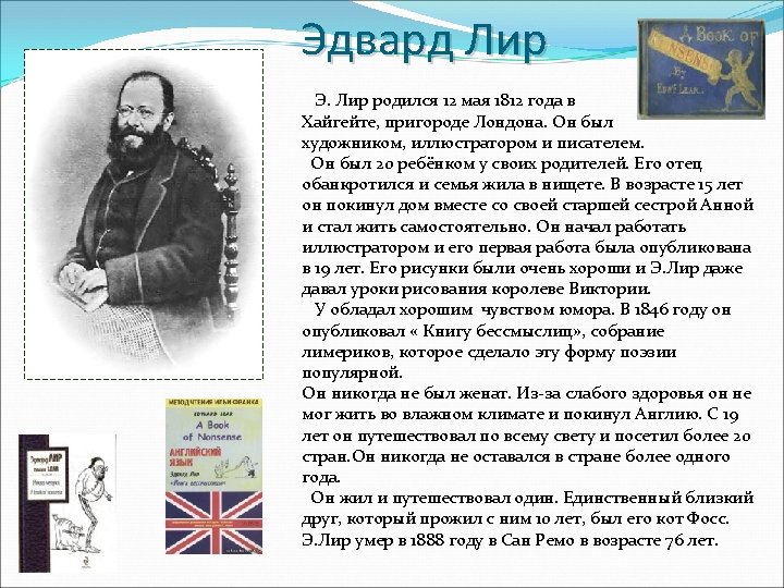 Эдвард Лир Edward Lear was born on the 12 th of May 1812 in Highgate, a suburb of London. He was an artist, illustrator and writer. He was the 20 th child of his parents. His father had gone bankrupt and the family had to live in poverty. At the age of fifteen, he and his eldest sister Ann left the family home and set up house together. He started work as a serious illustrator and his first publication was at the age of 19. His paintings were very good and Edward Lear gave drawing lessons even to Queen Victoria. He had a good sense of humour. In 1846 he published “A Book of Nonsense”, a volume of limericks which make this form of poems popular. He was never married. Because of bad health he couldn’t live in wet climate, and Lear left England. From the age of nineteen he travelled round the world and visited more than twenty countries. Lear did not stay anywhere longer, than for a year. He lived and travelled alone. The only close friend, who lived near Lear for ten years, was his cat Foss. He died in San Remo at the age of seventy six in 1888.