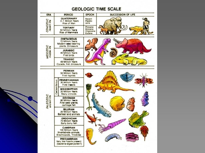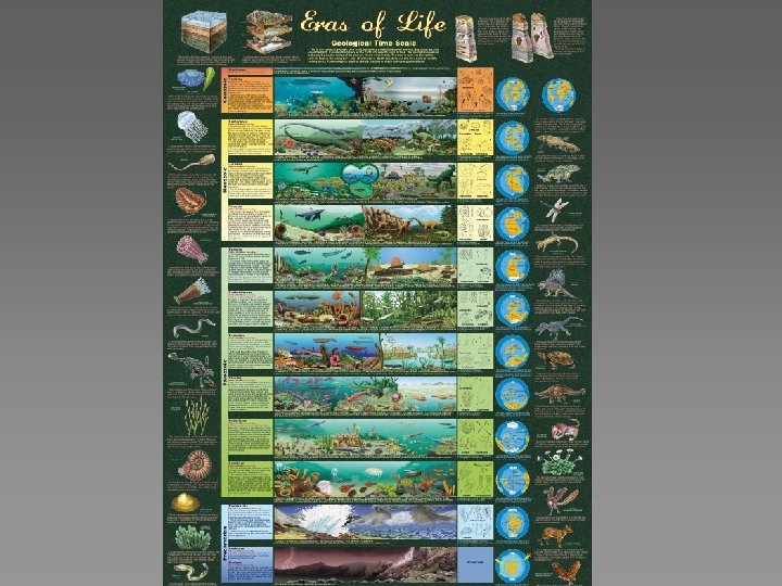 Divisions in Geologic Time Scale Divided into eras, which are characterized by the type of organisms that dominated the Earth at that time l Precambrian Time: from formation of Earth 4. 6 billion years ago to about 543 million years ago l l Volcanic eruptions, meteorites, intense radiation from the sun