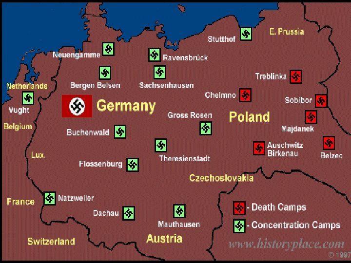 CONCENTRATION • • 100 of these in Nazi-occupied Europe prisoners used forced labor prisoners usually lasted less than 1/2 year communists, homosexuals, criminals, social -democrats, artists. • First camp was opened in 1933, right after Nazis came to power