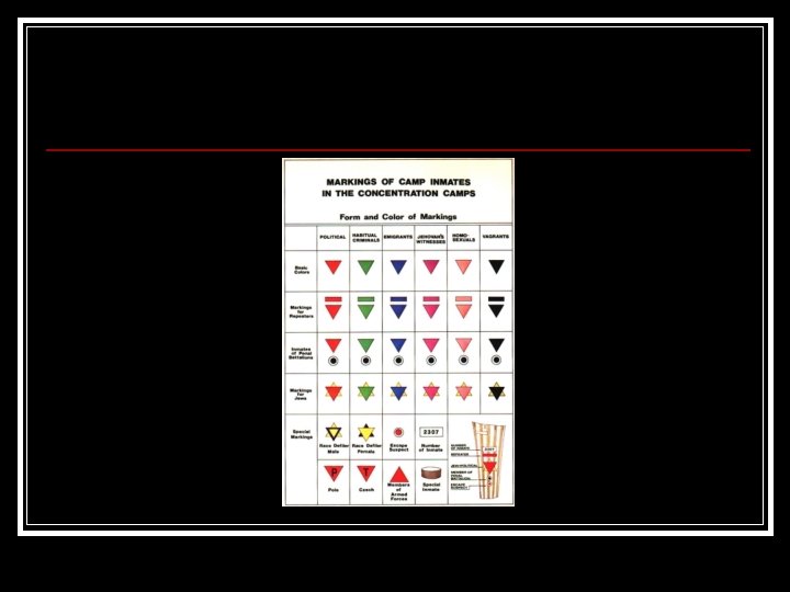 Life Within the Camps Prisoners were dehumanized n Prisoners were divided and labeled based on their status (Jew, Pole, homosexual, political prisoner) n Given a uniform and in some camps given a number n