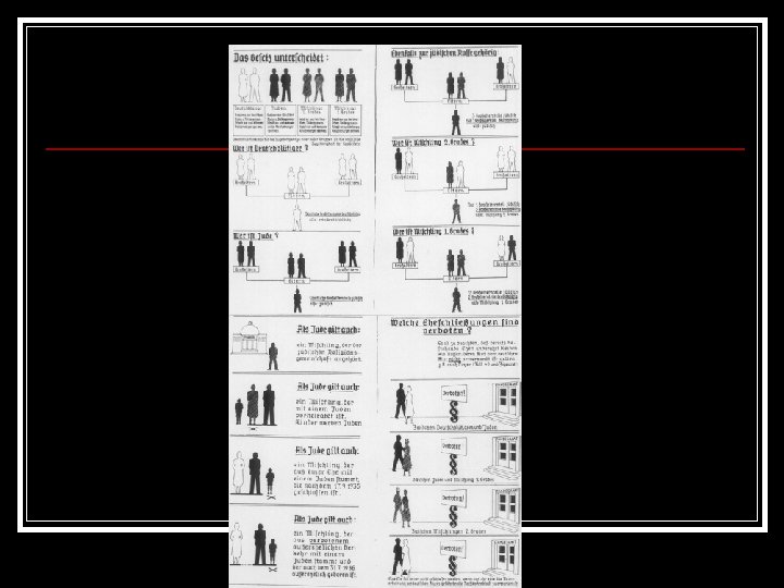 Nuremberg Laws (a few examples) Could not do the following: n Own businesses n Shop at Aryan businesses n Go to school n Could not work as a civil servant n Marry an Aryan n Work in a bank n
