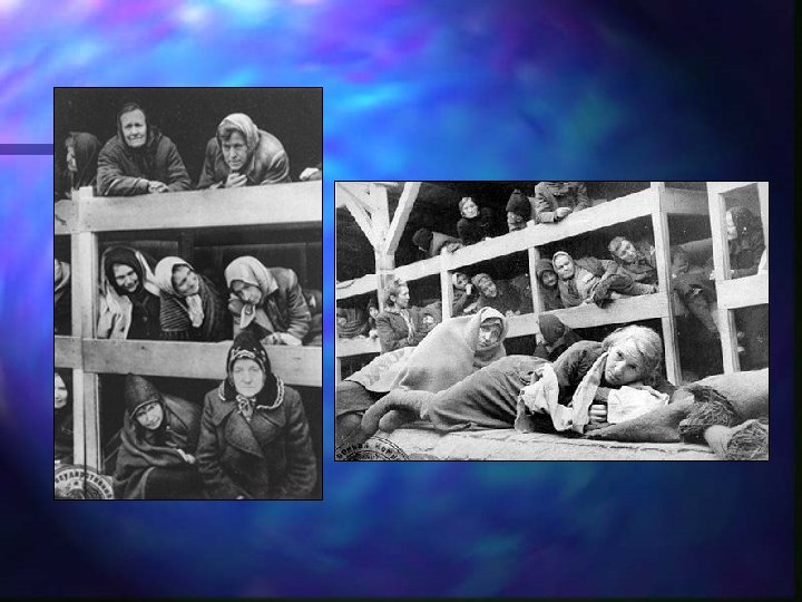 A large pile of prayer shawls (tallesim, tallitot), that were confiscated from arriving prisoners, are stored in one of the warehouses in Auschwitz. (After January 27, 1945)