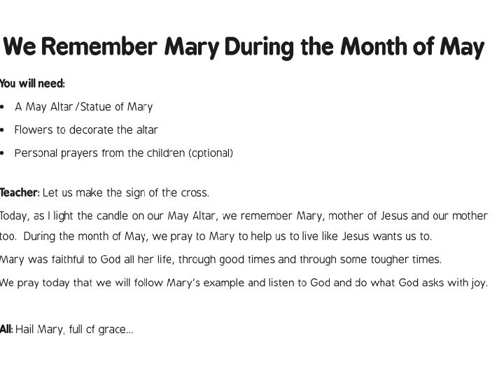 You could make up your own collective worship or liturgy with theme of Mary and May. Here is an example liturgy which you could use to help you.