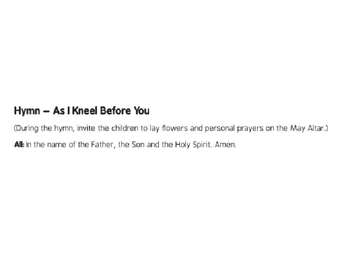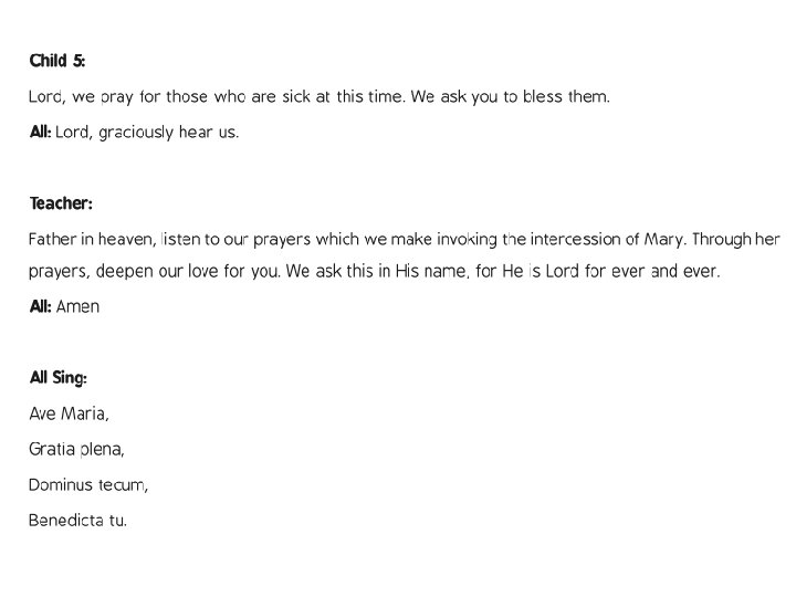 The Rosary Prayer Cont. 3. The Hail Mary Prayer (three times) Hail Mary, full of grace, the Lord is with thee; blessed art thou among women and blessed is the fruit of thy womb, Jesus. Holy Mary, Mother of God, pray for us sinners, now and at the hour of our death. Amen 4. The Glory Be to the Father Glory be to the Father, and to the Son, and to the Holy Spirit, as it was in the beginning, is now, and ever shall be, world without end. Amen 5. The Our Father Prayer 6. The Hail Mary Prayer (ten times) 7. The Glory Be to the Father