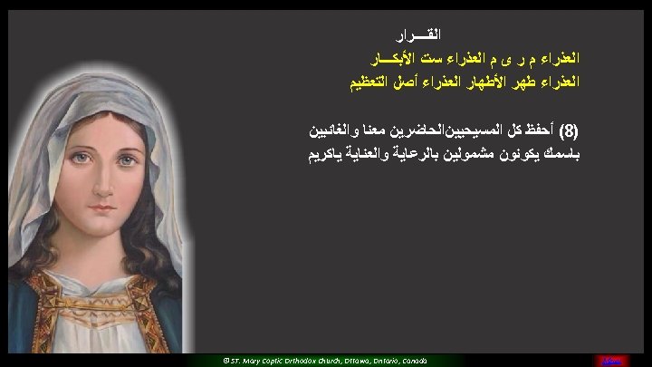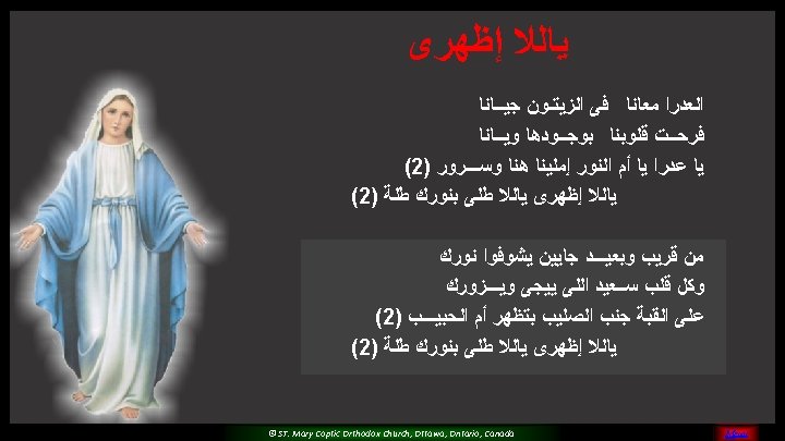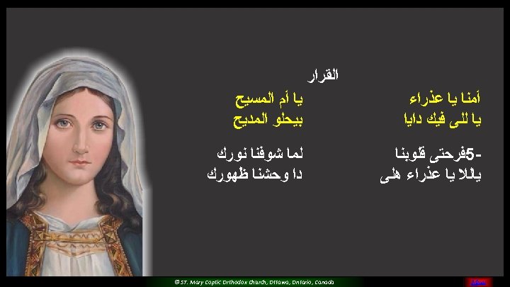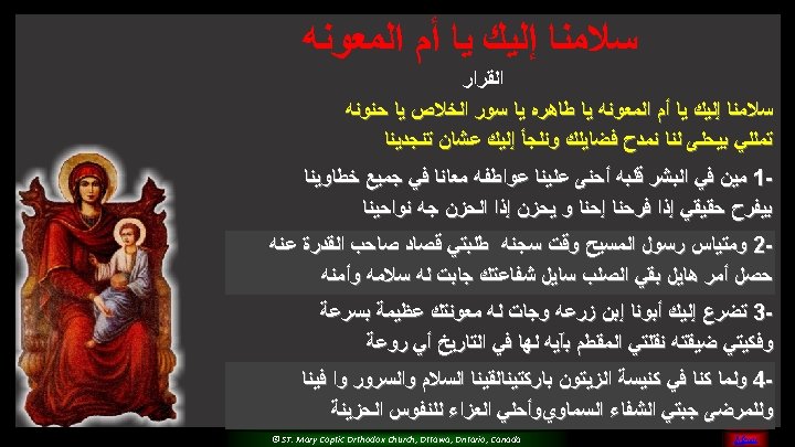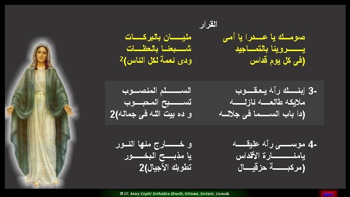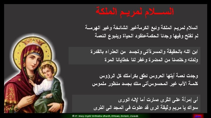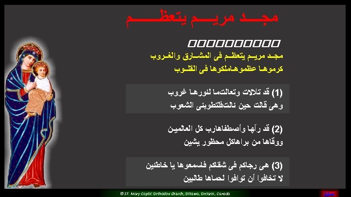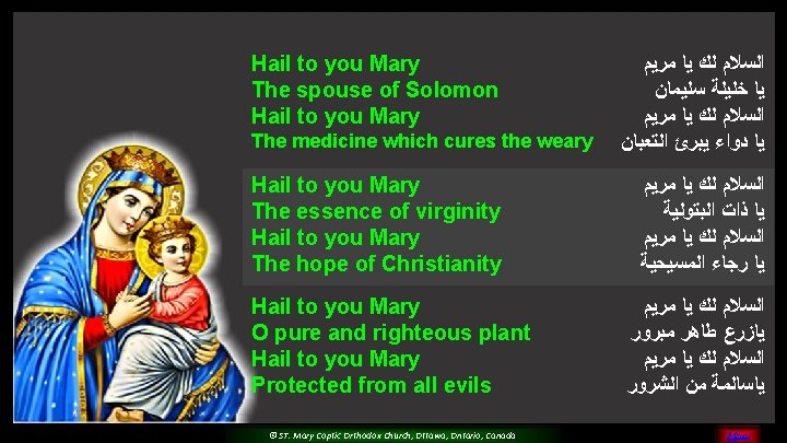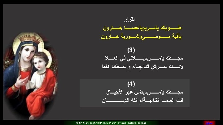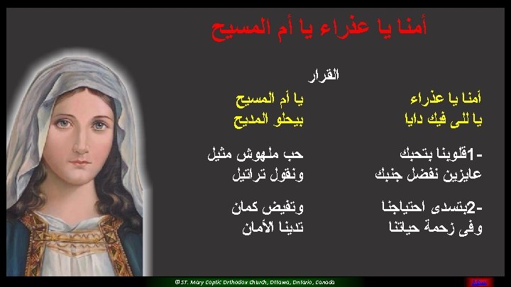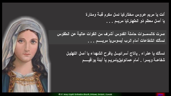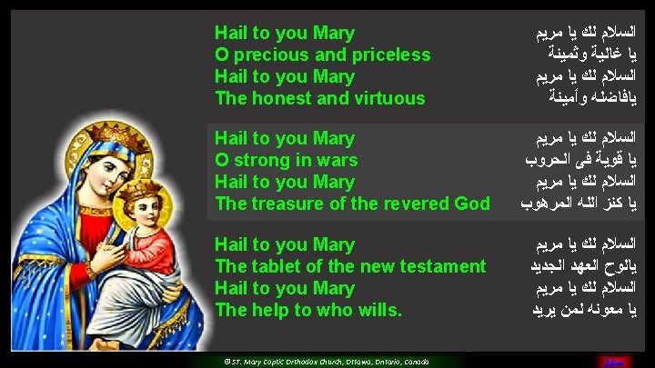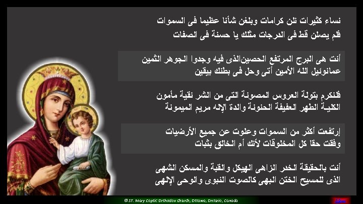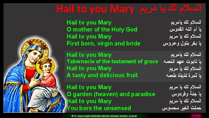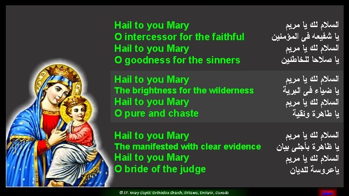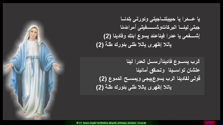 (5) Please O Mary, Pray for us And sinners to return Teach us and guide all of us For you are the faithful saint © ST. Mary Coptic Orthodox Church, Ottawa, Ontario, Canada MENU