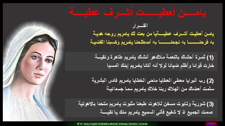 Hail to the pure vessel : Bearer of the Great Mystery And through whom was fulfilled : The promise to the ancestry Hail to the glorious one : Who is called blessed by us By all the generations : And all the rest In the name of the Father : And Son and Holy Spirit The Holy Co-essential Trinity : Worthy Is Saint Mary the Virgin © ST. Mary Coptic Orthodox Church, Ottawa, Ontario, Canada MENU