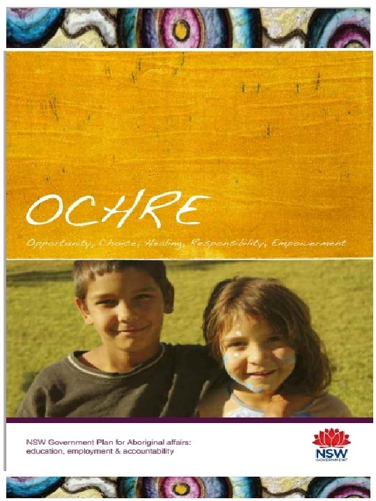 OCHRE emphasises: • • • Partnerships over paternalism Opportunity over disadvantage Successes over shortfalls ‘Listening to’ over ‘talking at’ Local solutions over ‘one size fits all’ Evidence over assumptions Participation over marginalisation Practice over theory …… and recognises the importance of Healing. OCHRE aims: To support strong Aboriginal communities in which Aboriginal people actively influence and fully participate in social, economic and cultural life, we need to: • Teach more Aboriginal languages and culture to build people's pride and identity • Support more Aboriginal students to stay at school • Support more Aboriginal young people to get fulfilling and sustainable jobs • Grow local Aboriginal leaders’ and communities capacity to drive their own solutions • Focus on creating opportunities for economic empowerment • Make both Government and communities more accountable for the money they spend