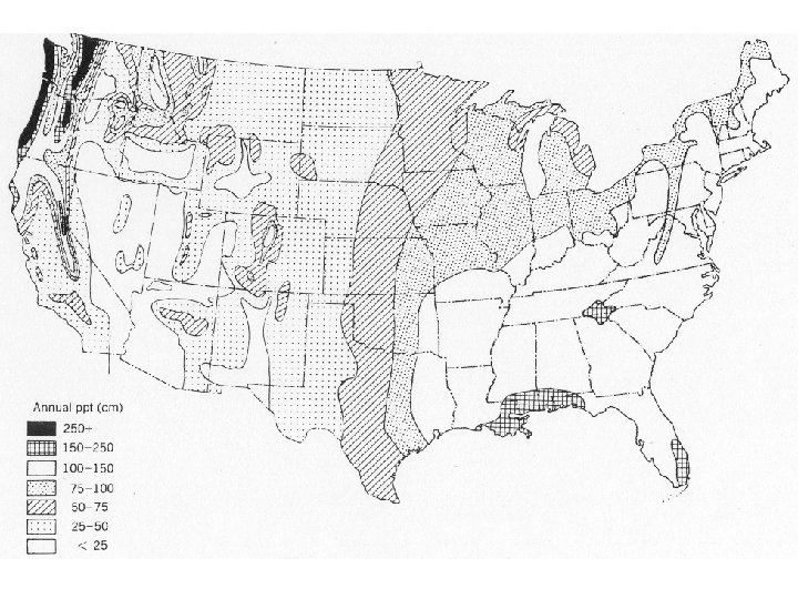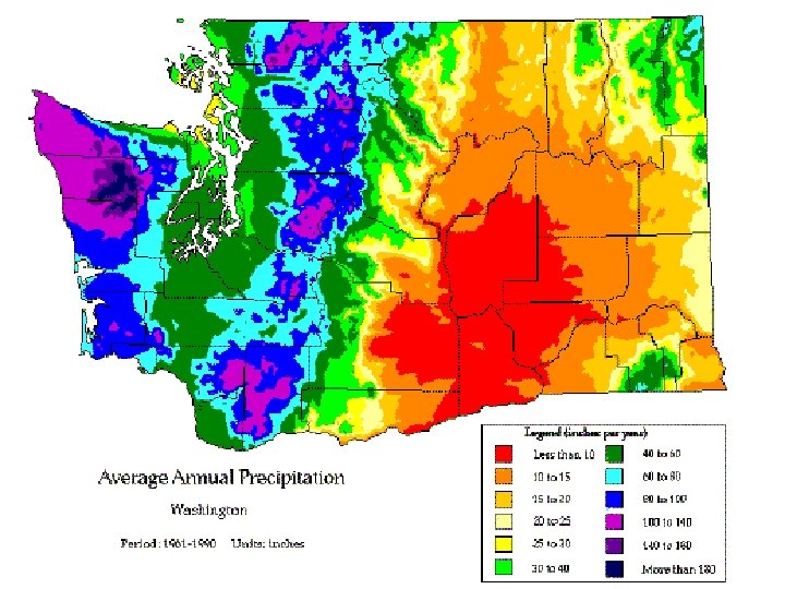 Precipitation • a) Circulation patterns of air masses, especially storm paths. • b) Distance and direction from large water bodies like oceans and seas, and large lakes. • c) Location in relation to topographic barriers. • d) Altitude.