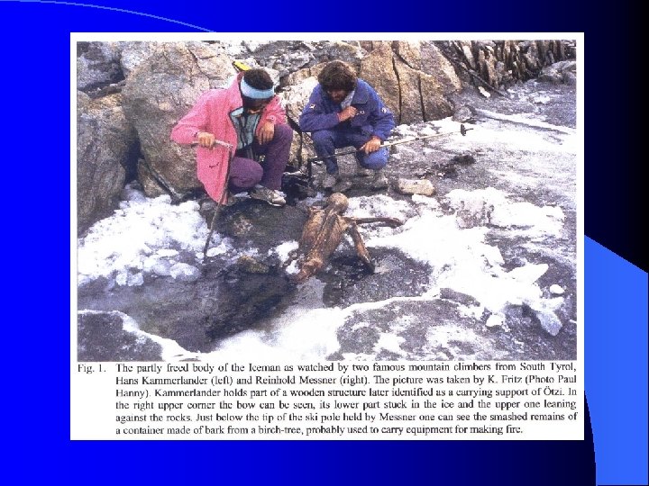 DNA Tests Suggest Ötzi Died After Violent Fight But Not Alone DNA tests conducted by molecular biologist Thomas Loy and his team (from the University of Queensland's Institute of Molecular Bioscience in Brisbane). • During their investigation they saw signs of trauma to Ötzi's body, including bruises (and cuts) on his abdomen (especially on his rib area), which (they concluded) indicates that he may have been beaten. • Samples were taken from the Iceman's antler-skinning tool, his stone-tipped knife, two of his arrows (one broken), his axe handle, and his goatskin coat. Using techniques devised especially for ancient DNA, the team found four different DNA sequences: one on the knife blade, two different sequences on one arrow, and a fourth on Ötzi's goatskin coat. (They also found a small tear in the coat which may have been the entry point of the arrowhead that was found embedded in his shoulder. ) • They interpreted these findings in this way: 1. The two different blood samples on the arrow may indicate that Ötzi killed two of his assailants and retrieved the arrow to use again. 2. The blood on his coat may indicate that Ötzi carried a wounded friend on his shoulder for some distance. • According to Dr. Loy "On the basis of all my examinations, [Ötzi's] specialty was hunting the high alpine passes for ibex and possibly chamois which would have taken him into boundary conditions where other people would have disputed the territory. His gear was stacked up neatly. He didn't keel over, although he was probably tired, exhausted and hurt like hell. "