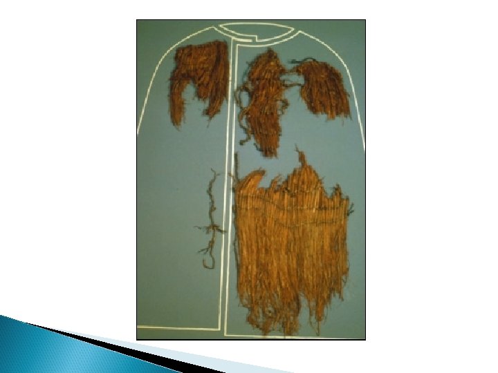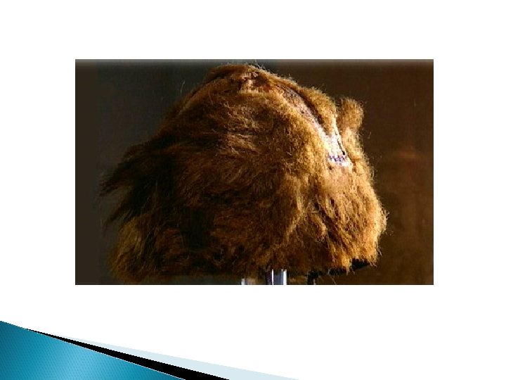 Clothes Ötzi's clothes were sophisticated. He wore: ◦ cloak made of woven grass and a coat ◦ a belt, a pair of leggings ◦ a loincloth made of leather of different skins. ◦ He also wore a bearskin cap with a leather chin strap. ◦ Shoes made of bearskin for the soles, deer hide for the top panels, and a netting made of tree bark. Soft grass went around the foot and in the shoe and functioned like modern socks.